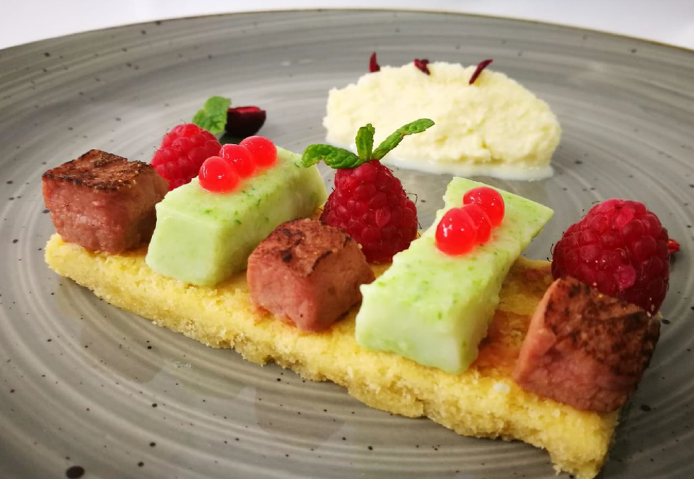 The Bavarian chicory underlines the importance of agriculture in Molise. The savory sablè is the base of our dish, a hard and crunchy texture reminds us of the land from which everything originates. The raspberry drop adds an innovative and tasteful technique to the dish.